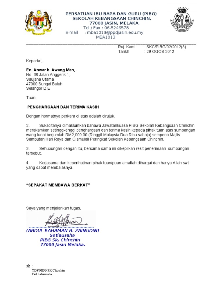 Sukacita dimaklumkan bahawa persatuan ibu bapa dan guru sk sinar mutiara telah berjaya menerima sumbangan kewangan sebanyak rm 2. Surat penghargaan dan terima kasih. Surat ucapan terimakasih secara resmi yang diberikan kepada sponsor bisanya dilengkapi dengan kop surat tanggal kepada isi dan penutup.